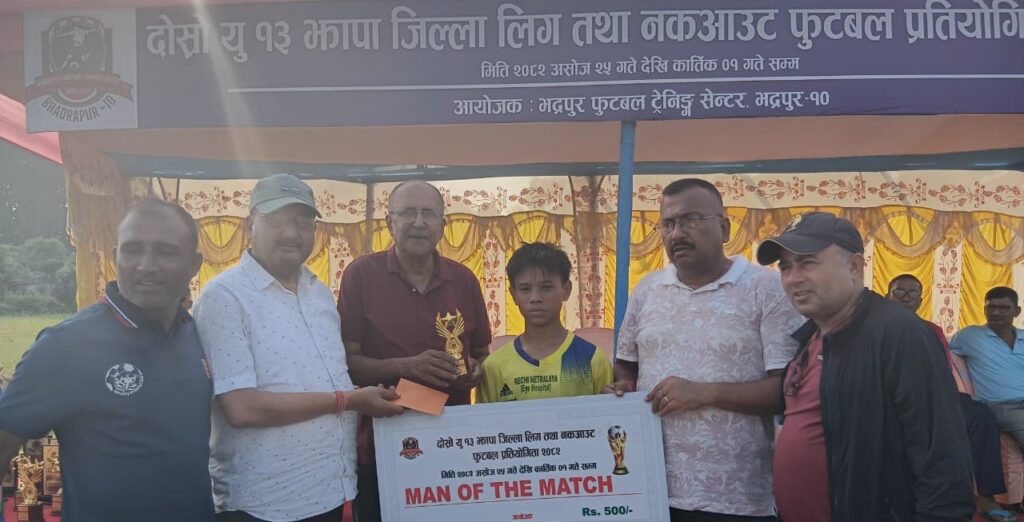 खेलको प्लेयर अफ द म्याच गोलकर्ता राई भए । उनलाई नेपाल उद्योग वाणिज्य महासंघ कोशीका निवर्तमान अध्यक्ष टिकाराज ढकाल, भद्रपुर झापा गोल्डकपका अध्यक्ष दिपेश ढकाल, व्यवसायी बाबुराम पराजुली, बिक्की जैसवाल लगायतले नगद ५०० र ट्रफी प्रदान गरे ।