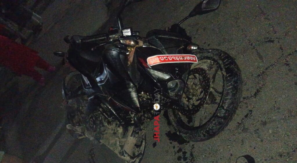 स्थानीयबासीका अनुसार दुर्घटनामा मेचीनगर-९ खुट्टीडाँगी नजिकै भएको हो । तीव्र गतिमा रहेको मोटरसाइकल अनियन्त्रित भई अटो रिक्सालाई ठक्कर दिएको बताइएको छ । दुर्घटनामा मोटरसाइकल लगभग दुई टुक्रा भएको छ ।