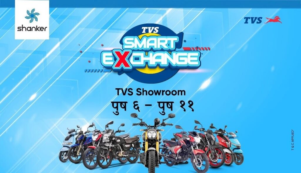 यही पुस ६ गतेदेखि ११ गतेसम्म बिर्तामोडस्थित टिभिएस सोरुममा सञ्चालन हुने यो कार्यक्रमअन्तर्गत जुनसुकै ब्रान्ड र अवस्थाका बाइक वा स्कुटर एक्सचेन्ज गर्दा न्यूनतम ३० हजार रुपैयाँको मूल्यांकन प्राप्त गर्न सकिने सञ्चालक याम कार्कीले बताए ।