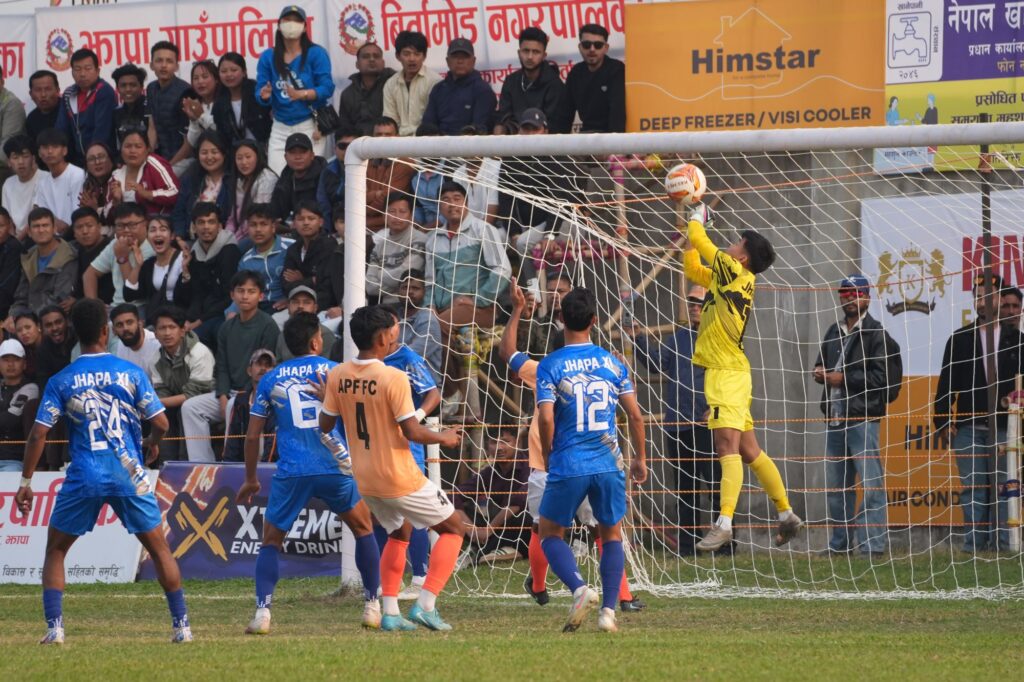 झापाको अग्रता ६ मिनेट पनि टिक्न सकेन । एपिएफका स्ट्राइकर नविन लामाले ६७ औँ मिनेटमा खेललाई बराबरीको अवस्थामा पुर्याए । लामाले डिबक्स बाहिरबाट गरेको प्रहार क्रस बारमा लाग्दै गोलमा परिणत भएको थियो ।