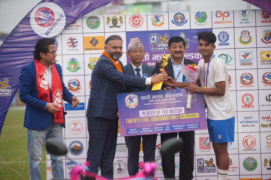 खेलको प्लेयर अफ द म्याच विजेता टिम मछिन्द्रका प्रदिप बुढाथोकी घोषित भए । उनले नगद २५ हजार रुपैयाँ पुरस्कार पाए ।