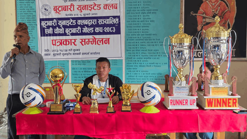 बिर्तामोड, चैत २५ । चौथो संस्करणको बुट्टाबारी गोल्डकप फुटबल प्रतियोगिता २०८३ बैशाख ५ गतेदेखि हुने भएको छ । झापाको बिर्तामोड–६ बुट्टाबारीस्थित हरियाली वनमा हुनेछ ।
