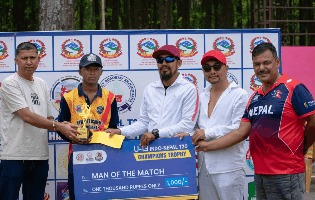 बिर्तामोड, बैशाख २ । झापाको अर्जुनधारा–९ स्थित नमुना खेल मैदानमा जारी इन्डो–नेपाल यु–१३ टि–२० क्रिकेट च्याम्पियन्स ट्रफीअन्तर्गत समूह ‘बि’ को दोस्रो खेलमा इनरुवाको फूलबारी स्पोट्र्स एकेडेमीले भारत पटनाको एचपी (हाई पर्फमेन्स) क्रिकेट एकेडेमीमाथि ४ विकेटको रोमाञ्चक जित निकालेको छ ।